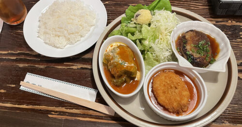 ハンバーグ,クリームコロッケ,ロールキャベツが一皿に盛られたランチで、